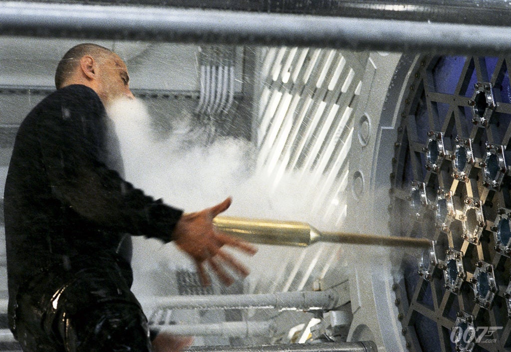 Bond boards the sub as it submerges, and causes a fire that sends the sub crashing to the sea floor. Confronting Renard, 007 tells him Elektra is dead sending the terrorist into a blind fury. A brutal fistfight ensues ending when Bond launches a plutonium rod straight at Renard’s heart. As the submarine reactor is set to overload, Bond and Jones escape deploying the submarine’s torpedo launcher, moments before the submarine explodes.