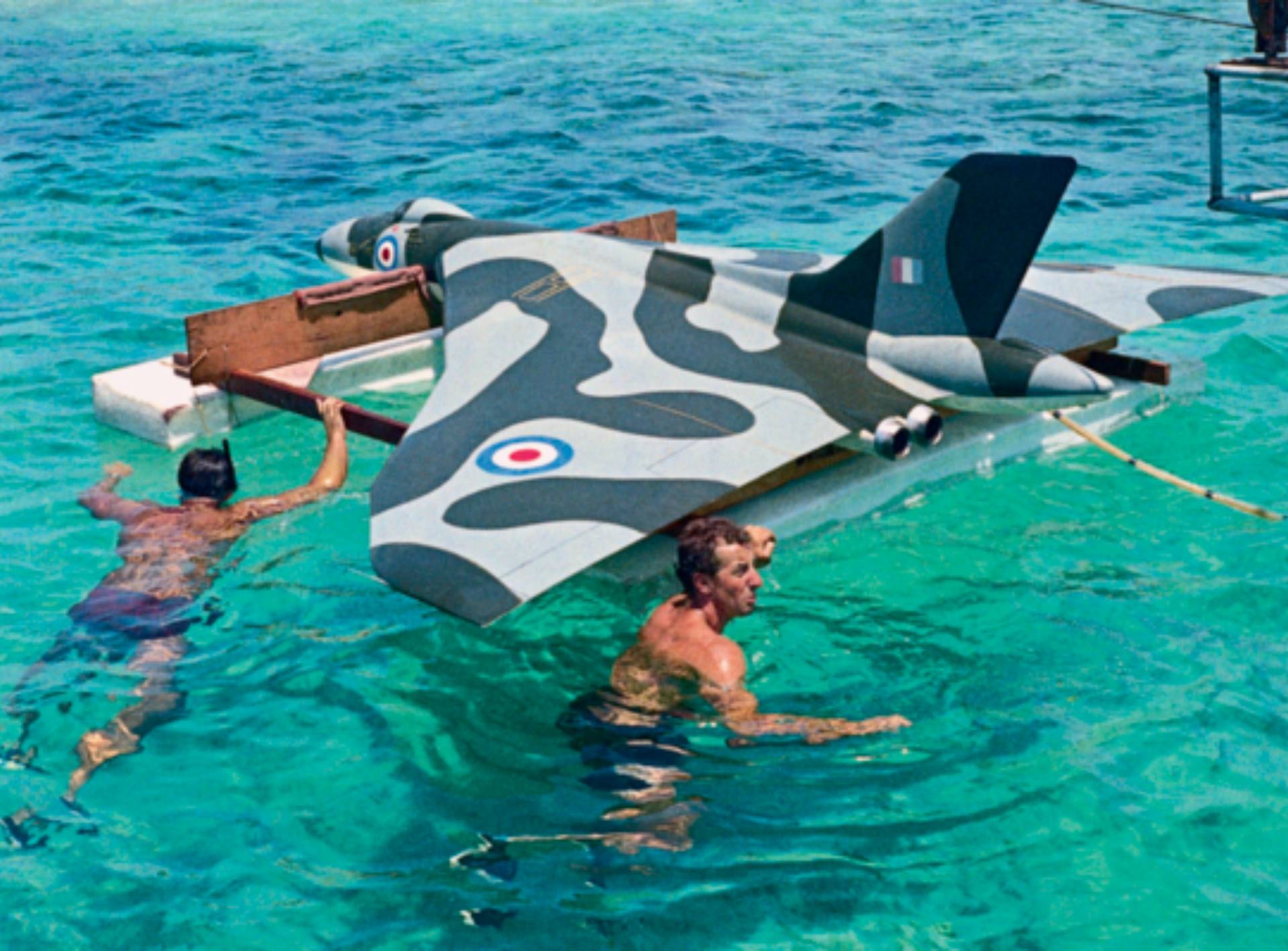 The miniature: A RAF-V-Force bomber carrying two atomic bombs is stolen by SPECTRE henchman Angelo Palazzi (Paul Stassino). The aircraft subsequently lands in the middle of the ocean near the Bahamas and is left on the seabed.