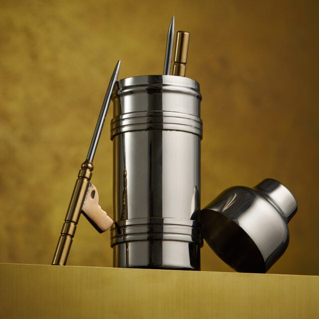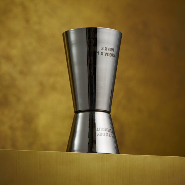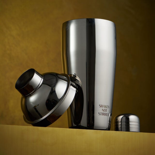 Discover a new collection of pro-grade cocktail tools to help you make the perfect martini at home. Measure, shake, garnish, and pick your olive. Explore smart details, including a dipped space to hold your lemon, a list of the perfect quantities, and storage inspired by Bond’s Thunderball diving tank.