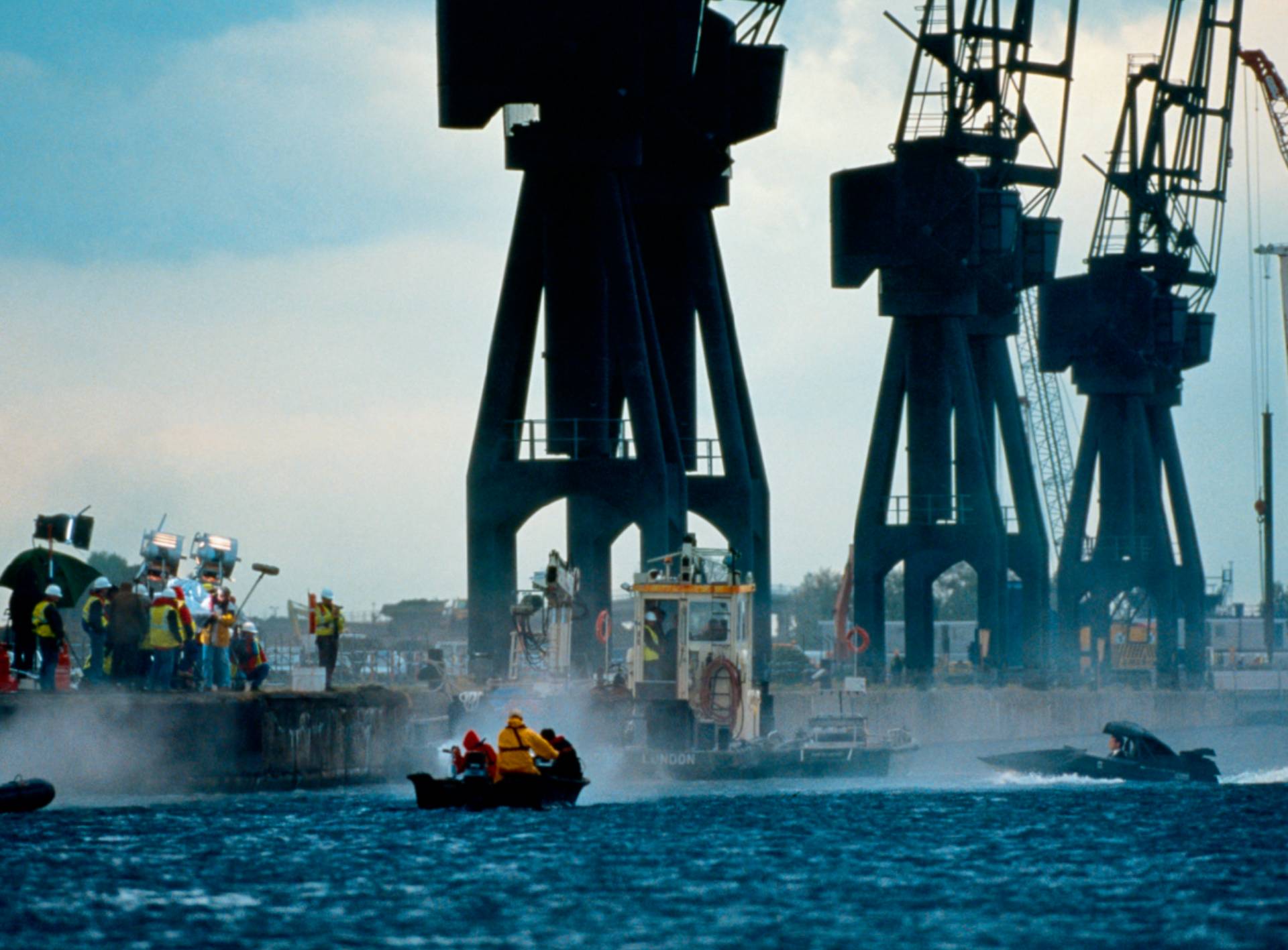 The Shot: Following an explosion at MI6 HQ, Bond jumps in a work-in-progress Q dept boat and chases an assassin (Maria Grazia Cucinotta) down the Thames, finally destroying her boat at the Millennium Dome. Directed by action unit director Vic Armstrong, this shot sees the Q Boat speeding along the Thames near the cranes at Royal Victoria Dock.