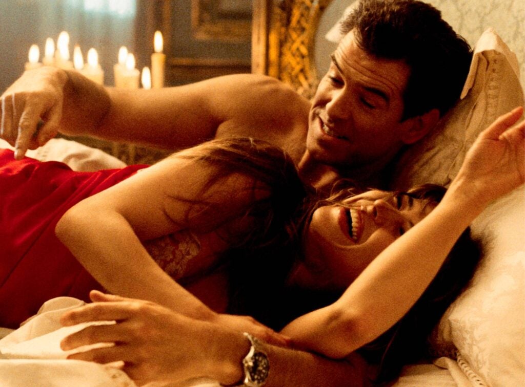 The Shot:  Captured on the villa bedroom set on Pinewood’s C Stage, Pierce Brosnan and Sophie Marceau share a lighter moment rehearsing an intimate scene between Bond and Elektra.
