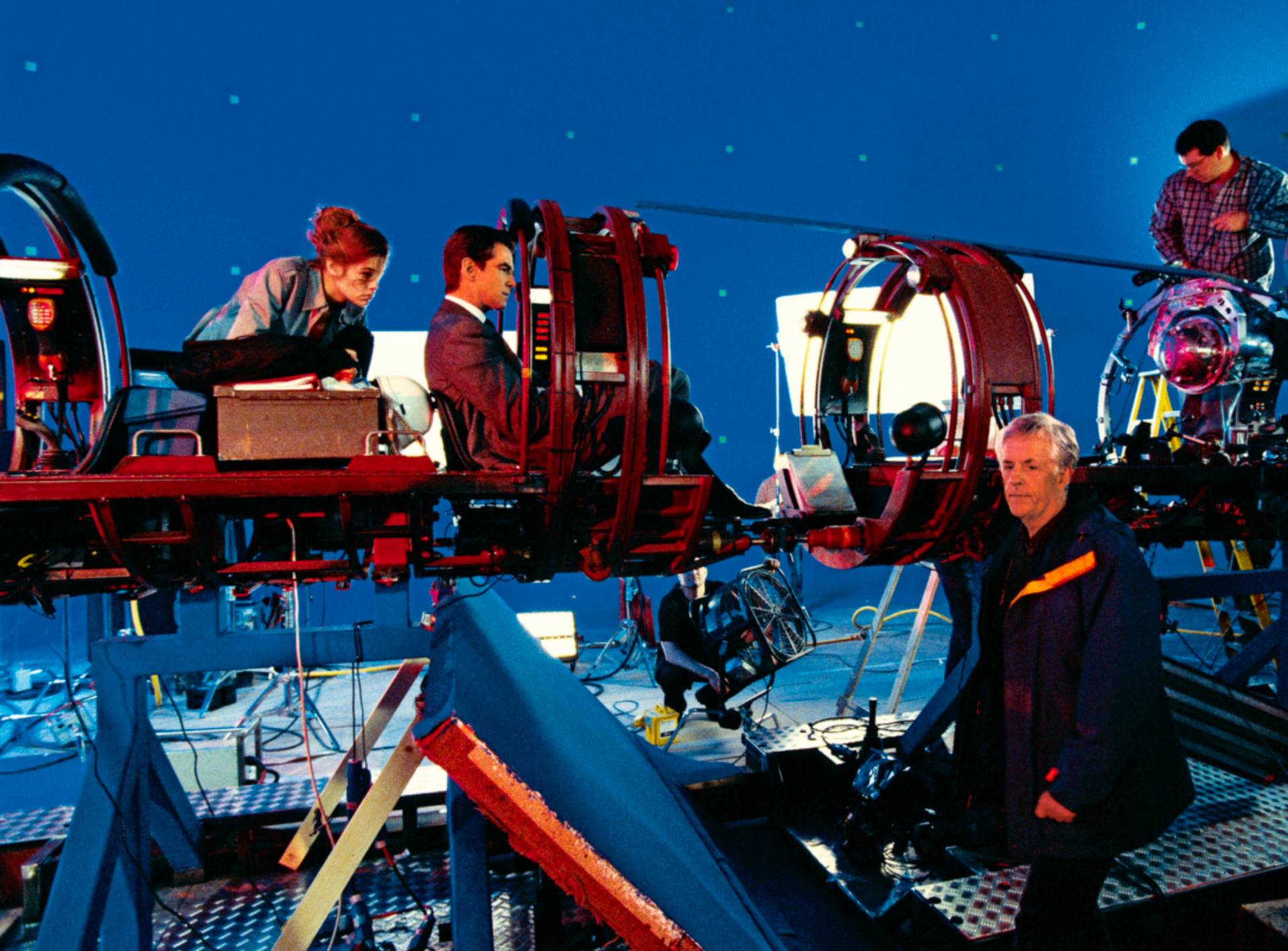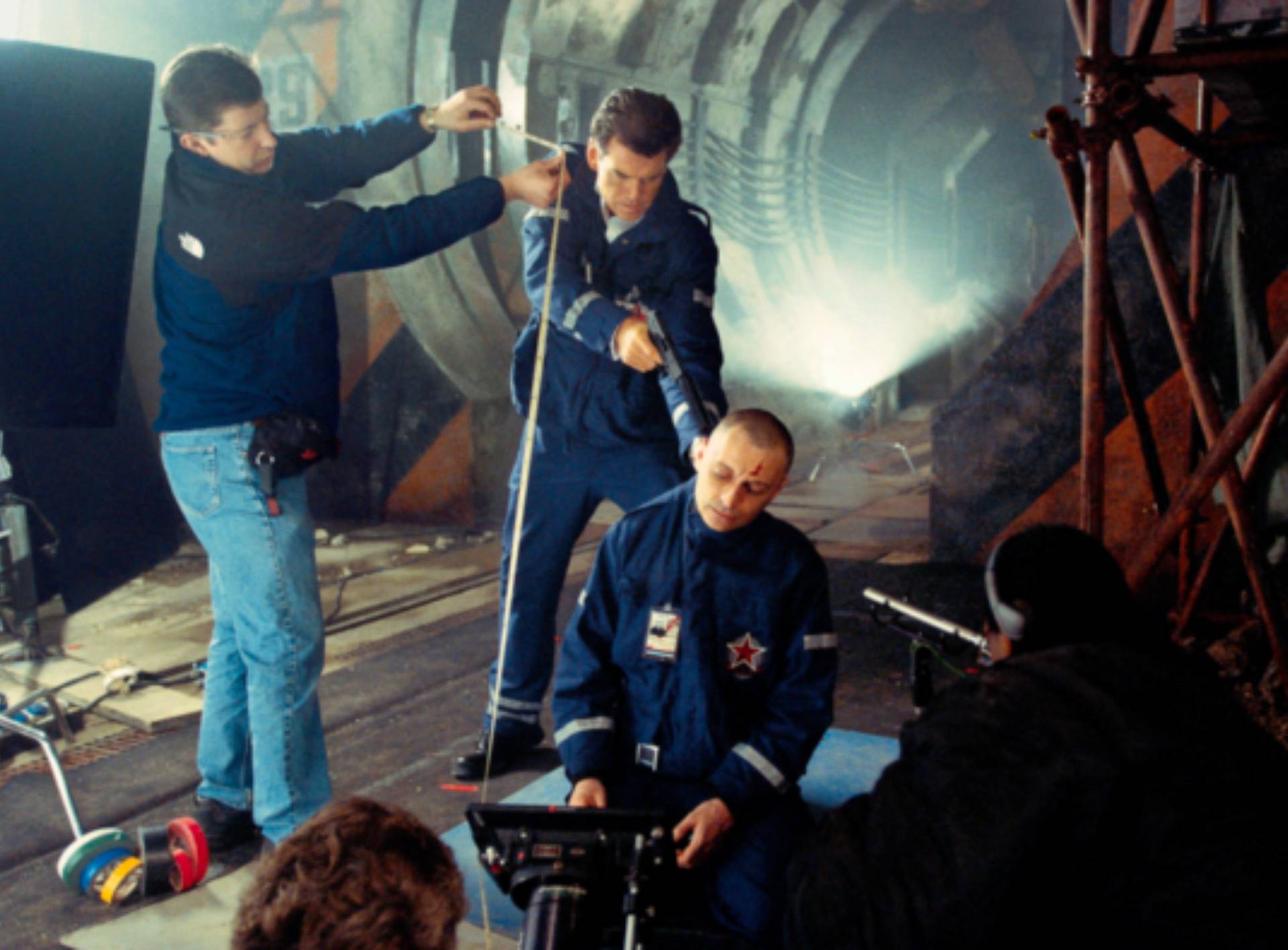 The shot: Renard plants a stolen warhead onto an inspection cart inside the pipeline with the aim of blowing it up, Here the crew shoot Bond and nuclear scientist Dr. Christmas Jones (Denise Richards) against bluescreen, speeding down the pipeline in another rig so the scientist can defuse the warhead. At the last minute, Bond suggests to let the explosive charge detonate giving the illusion the pair have died in the blast.